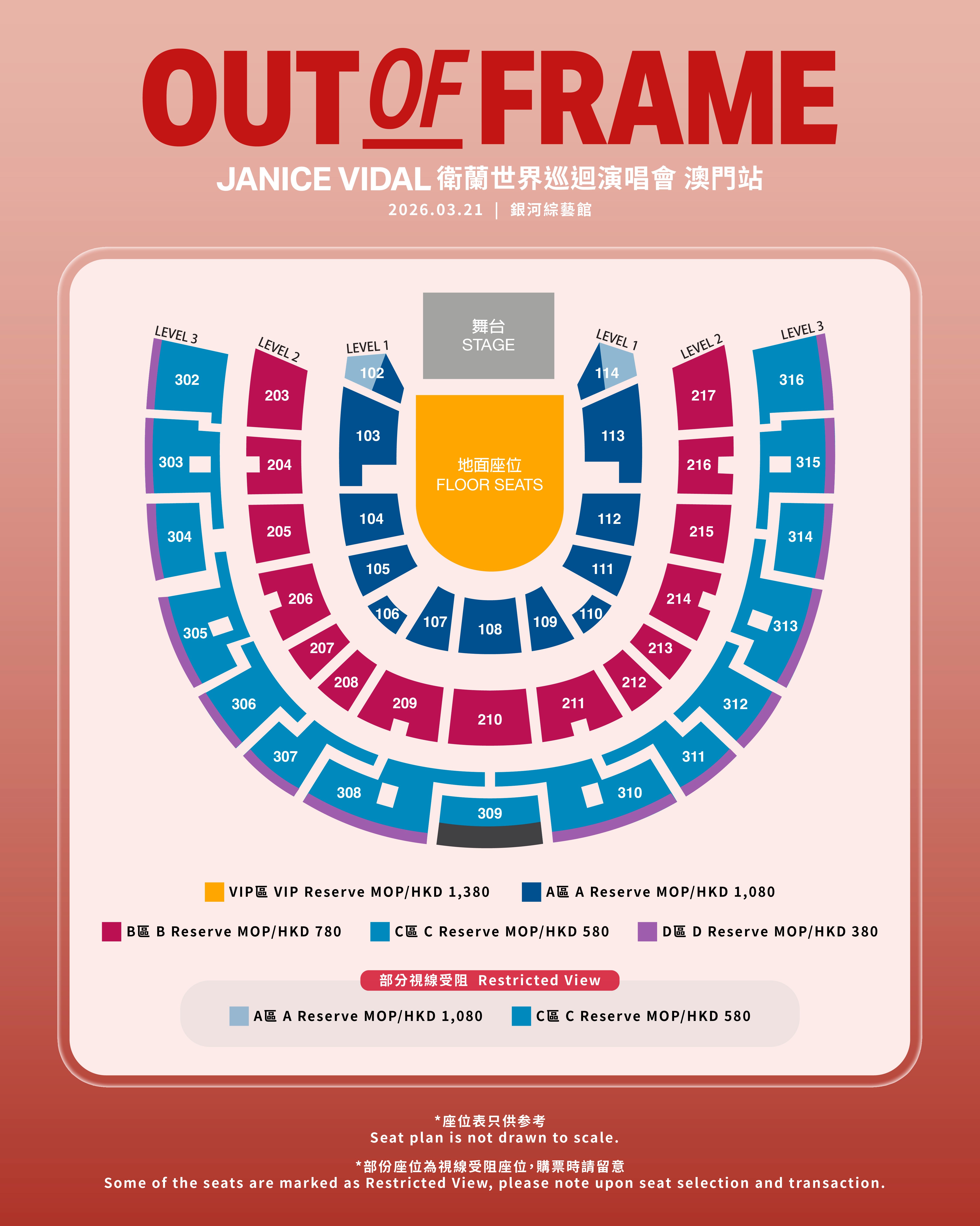 | Ticket Price: | MOP/HKD 1380/ 1080 / 780 / 580 / 380 *The settlement currency shall be based on respective ticketing platforms. |